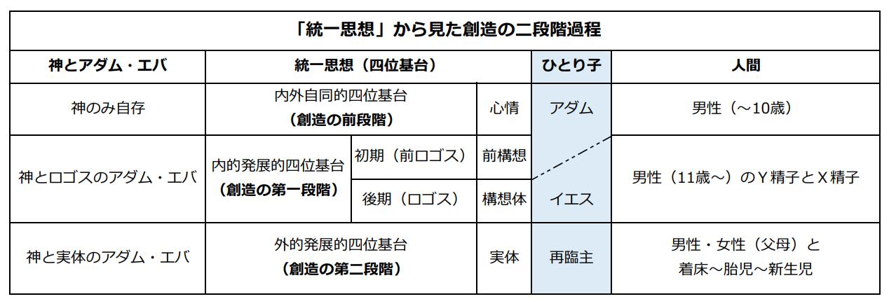 つまり、アダムが勝利したこととは、霊的堕落をしていないこと、創造の第一段階においてYとXの精子を実体で生成できたことです。地上にこのような実体の基台が造成されたため、この基台の上で、神は再び「ひとり子」としてイエス様を地上に送ることができたと言えます。