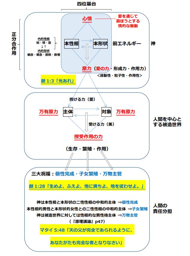 その結果、授受作用の力、すなわち生存と繁殖と作用の力が生じるわけですが、これらの力によって人間は個性完成、子女繁殖(家庭完成)、万物主管を完成していくようになっています。